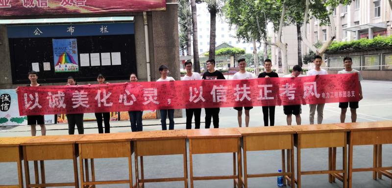 此次活动采取自愿签名的形式,活动开始前,我电力系团总支综合部的学生干部们来到活动地点,对活动现场进行了布置:大家提前放置好宣传展板、拉起了横幅,提前做好了准备工作,下课后,大家看到印有“以诚美化心灵,以信服振考分”的横幅与宣传展板时纷纷停下了脚步,投来了肯定的目光,参与到了此次签名活动中来,这也加深了他们诚实考试的意识,不到一会儿,横幅上已经写满了同学们的名字。在场的同学们都表示今后会更加诚实守信,不光是在本次考试中坚守诚信,更是会在今后的学习生活中提高自己的思想道德修养,争做懂文明、懂礼貌,诚实守信的大学生。