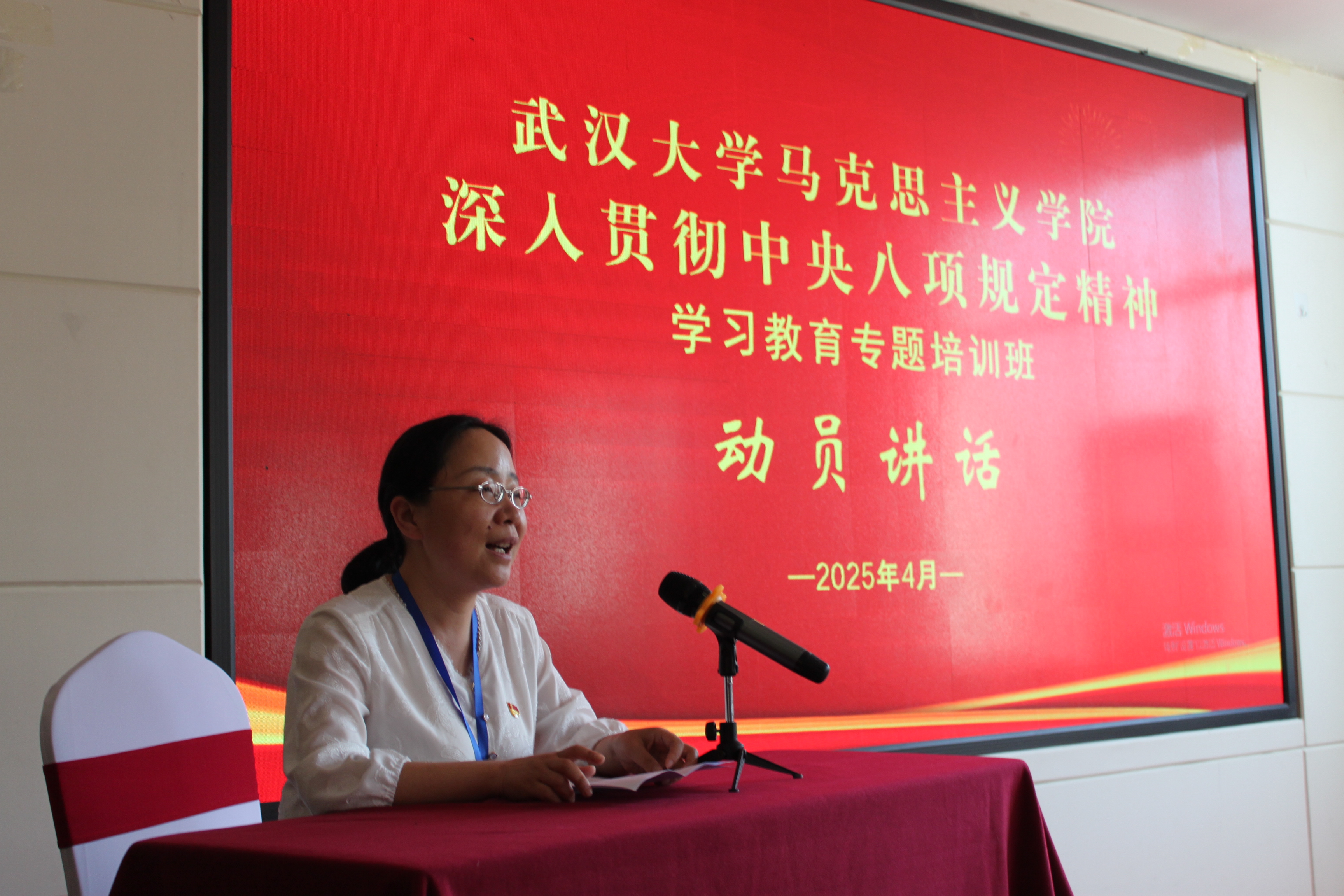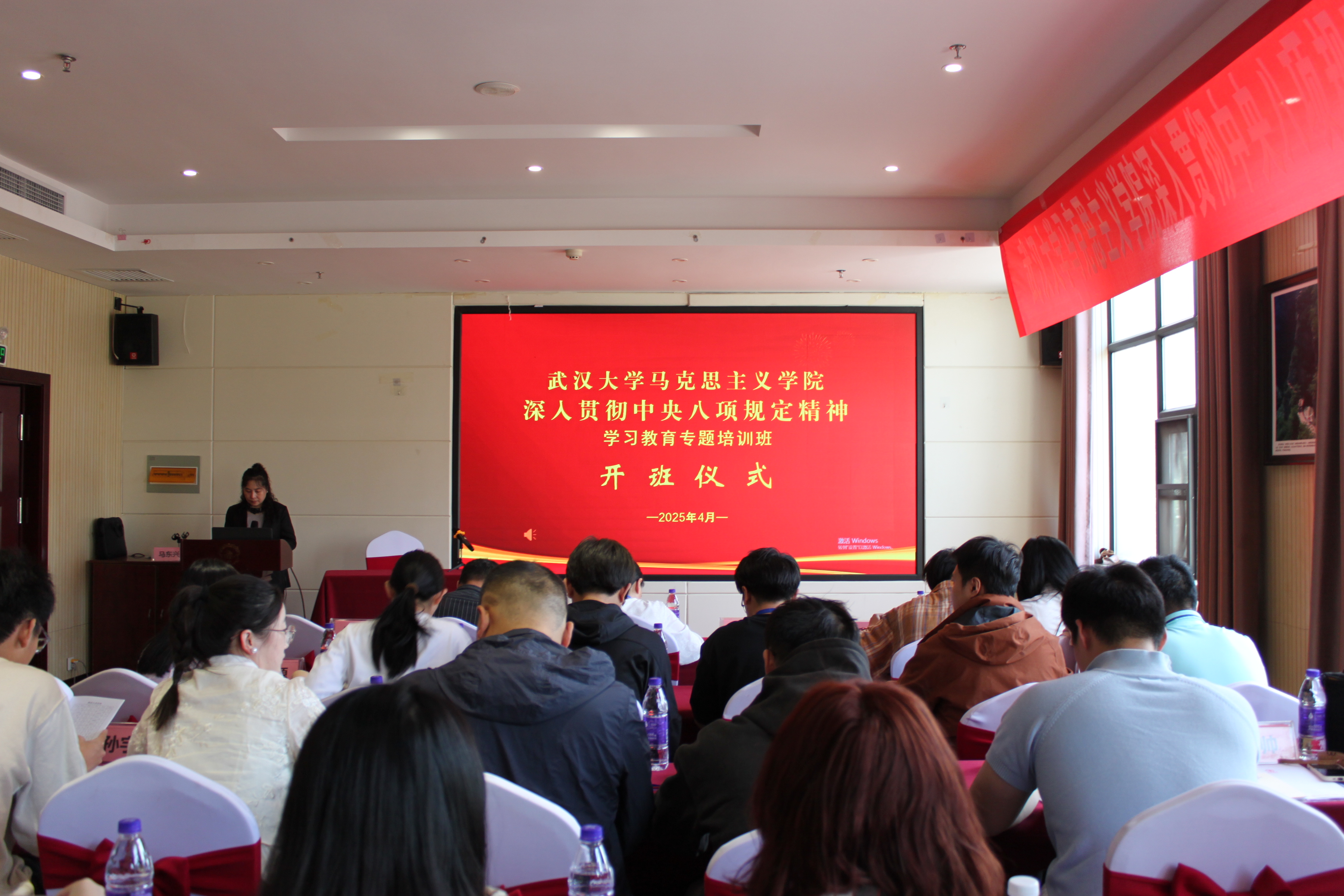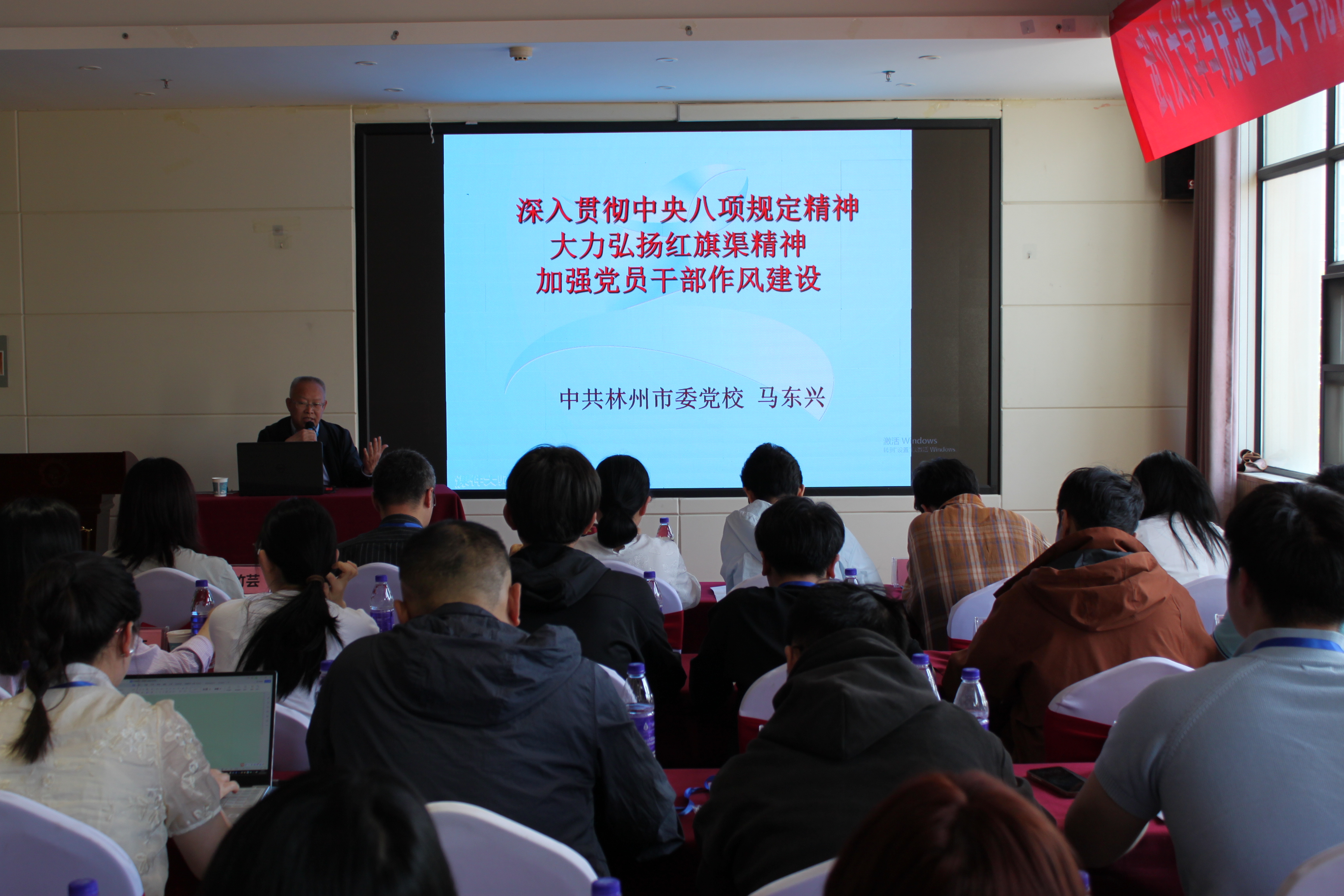 在动员讲话之后,林州市委党校副校长马东兴为参训学员们开授题为《深入贯彻中央八项规定精神学习教育,大力弘扬红旗渠精神,加强党员干部作风建设》的讲座。马东兴在讲解中央八项规定的具体内容基础上,从适应世情、国情、党情的变化角度,指出了中国共产党加强作风建设的现实必要性;并提出要大力弘扬红旗渠精神,加强党员干部作风建设。