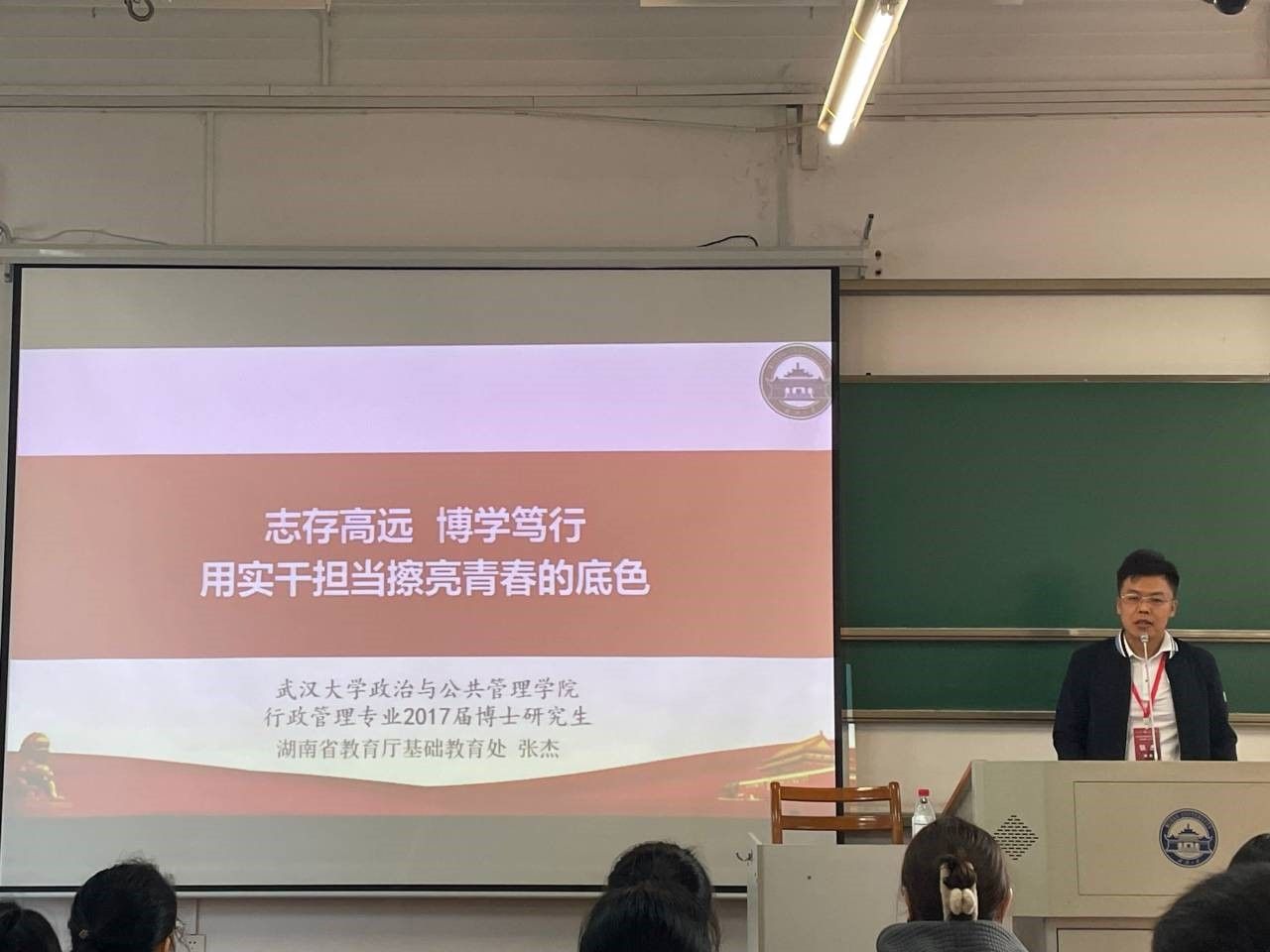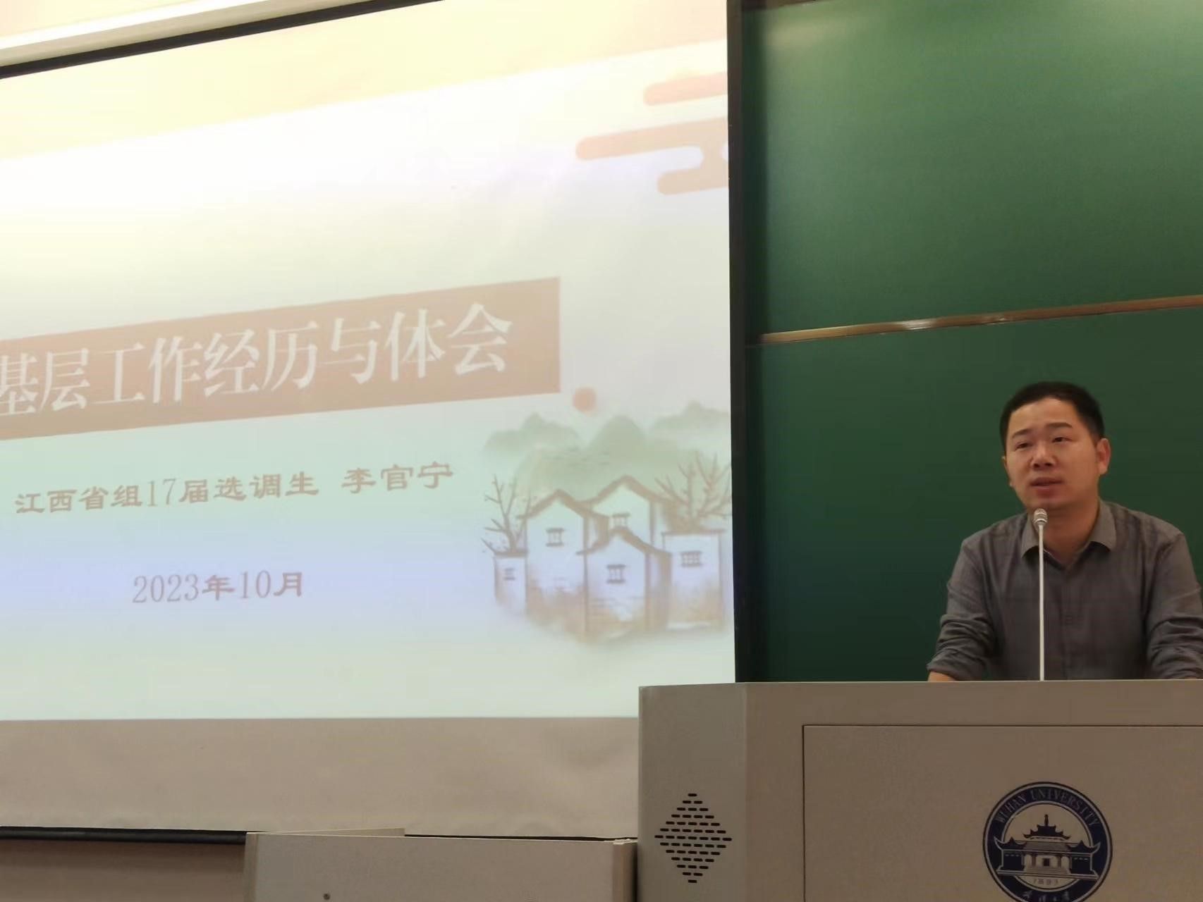 来自青海省的选调生姜文东校友,系欧博官网18届外国语言文学学院英汉笔译专业硕士研究生。他结合自己在基层的工作经历,讲解了如何做到理论与实际的结合,做到实事求是。在分享过程中,学生切实感受到了基层工作者的艰辛与不易,也能感受到基层工作者的远大抱负和理想,以及面对困难迎难而上的坚持和信念。每每讲到动情之处,姜文东同志的眼里都泛起了泪光,同学们也为之感动,深受鼓舞!